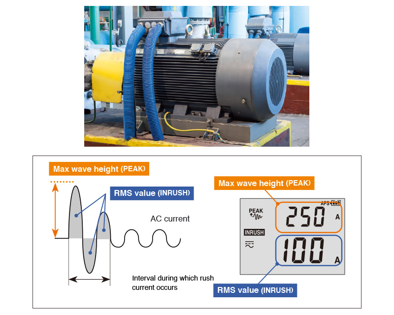 Las pinzas Hioki pueden simultáneamente medir corriente de arranque en RMS así como valor de cresta máximo en el arranque del motor y/o soldadura
