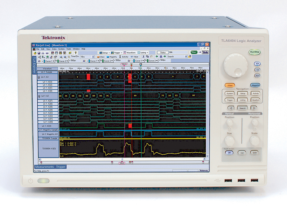 • » Glitch Trigger and Storage, Allows you to trigger on and highlight potential signal integrity problems. Not only can the TLA6400 Series trigger on the problem, but by highlighting suspected problems in red, you will be able to easily determine which signals you need to further investigate.